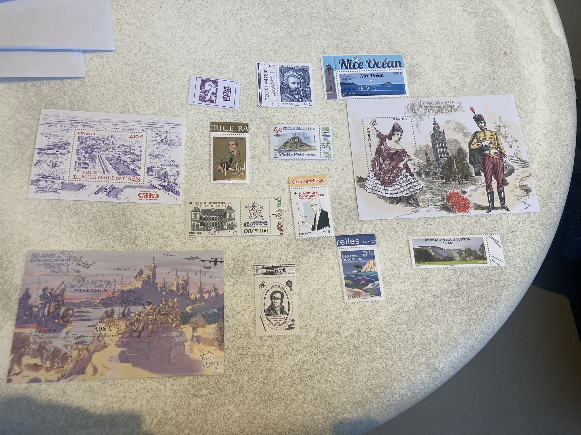 虽然后续也发生了一些故事,但可能写出来也没有一些参考意义。于是我们就跳到最后一个环节,走之前给一些亲朋好友寄送明信片。我并没有选择将邮票直接贴在明信片上,我是选择把信封包裹明信片并且还附带一张信,信里面写一些想说的话,然后把邮票贴在贴在信封上。明信片选购的是具有南特景色的明信片,要具有当地特色。而邮票也是选择的具有艺术化的邮票,可以给你们看一下。