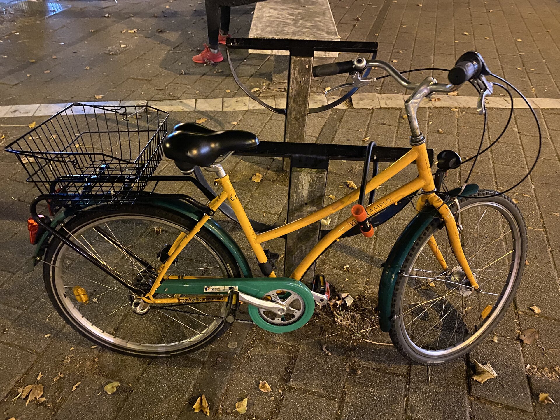 市中心Naolib Vélo需要报税单才能够申请到优惠价格,当然,如果你希望购买也能通过报税单在指定自行车销售点获得一折的折扣(需要了解南特市政府的政策下载对应的表格),这个取决于自行车的类型,但因为我们没有收入,所以获得的优惠是最大的那一档。所以如果我们是秋季入学的话,要等到来年的五月进行第一次报税,第一次报税必须亲自去,然后获得你的税号之后就可以线上报税了。你的税号还可以用来注册法国的证券账户,用来购买股票等等一系列金融服务,最重要的是0欧元的报税单,可以用来在市政厅申请免费的公交卡,如果你之前有付费公交卡,那么免费公交卡就会立刻在付费公交卡上生效,由于我们留学生通常家庭商数那一栏是失效的,所以去市中心的市政厅用0欧元的报税单就可以申请了,我除了第一年花费了公交费,之后的两年都是用这种方法进行的免费。在获得报税单之前,你可以考虑南特大学Vélo Campus提供的自行车租用服务,这个用你的学生身份就可以。租用的自行车如下所示。车后面这个篮子是我加的,买菜好用。